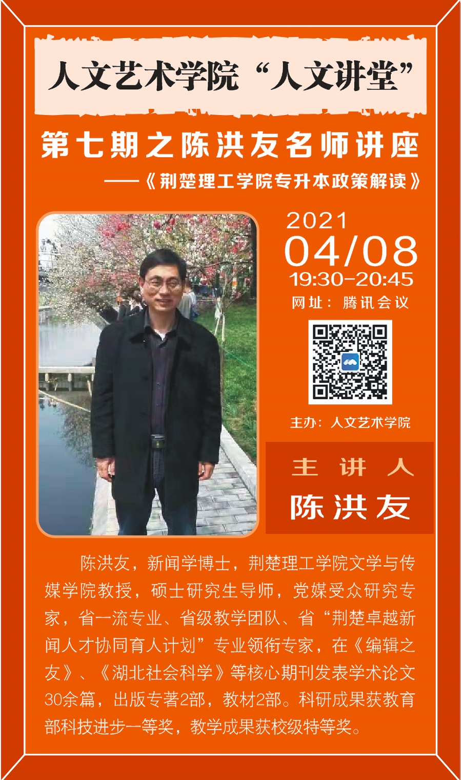 为了积极应对师范类专业学生严峻的就业形势,4月8日晚,人文艺术学院举办第七期“人文讲堂”名师讲座,邀请到荆楚理工学院文学与传媒学院教授、硕士生导师陈洪友,通过线上课堂为学生作2021年专升本相关政策解读。