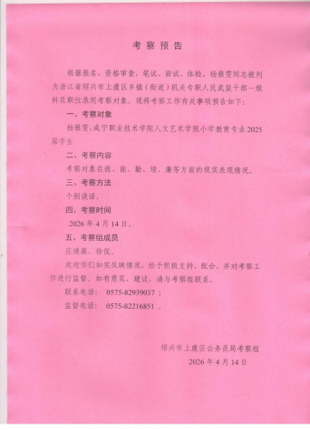 近日,人文艺术学院传来喜讯,2025 届小学教育专业毕业生杨雅雯顺利通过浙江省绍兴市上虞区乡镇(街道)机关专职人民武装干部一级科员职位笔试、面试、体检与组织考察,被正式列为录用考察对象,即将奔赴基层公职岗位建功立业。