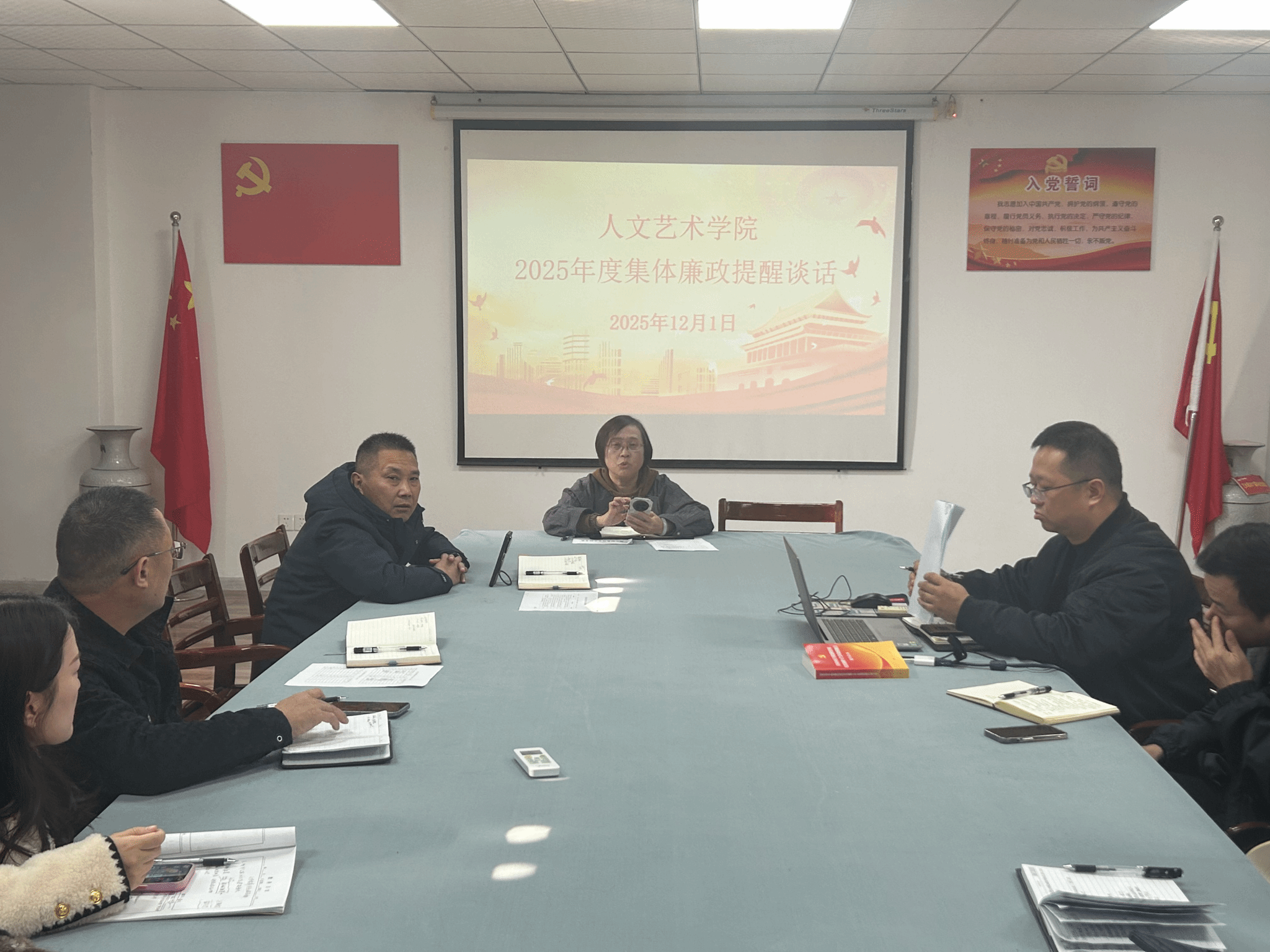 为进一步压实全面从严治党政治责任,强化对党员干部的日常监督、管理与教育,12月1日上午,人文艺术学院党总支书记韩飞在教育实训中心7楼会议室对全院中层干部、各部门负责人及党支部书记进行2025年廉政谈话。